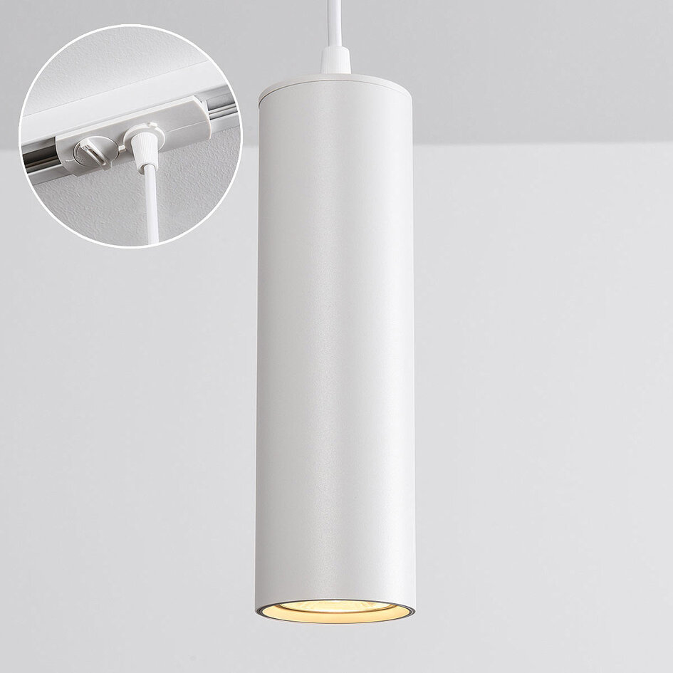 Simon misst Ø6 cm x L 20 cm und wird mit einer GU10-Fassung, einem Adapter und einem 150 cm langen weißen PVC-Kabel geliefert.