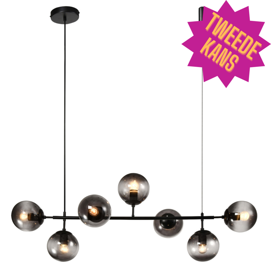 Ein schicker und verspielter Lichteffekt mit luxuriösen Glaskolben. Diese Designer-Pendelleuchte hat ein trendiges Design aus einem schlanken Stab mit luftigen Gläsern und sieben Kugeln in verschiedenen Glasmodellen. Die Glühbirnen sind festlich um den Stab drapiert; ein Design, das sowohl in zeitlosen als auch in modernen Interieurs für einen schicken Look sorgt. Besonders zu minimalistischen Wohnstilen ist die Pendellampe eine opulente Ergänzung und ein echter Blickfang. Denken Sie an die elegante Wirkung über einem Esstisch, einer Küchenbar oder einer Sitzecke. Aber auch im Schlafzimmer ist diese Designer-Pendelleuchte ein luxuriöses Detail, das sofort für Wärme und Atmosphäre sorgt.