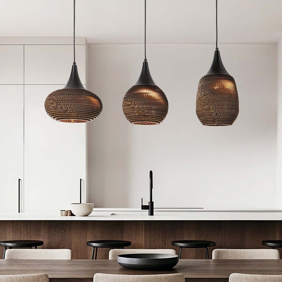 Schwarze und braune recycelte Pappe verbinden sich in dieser stilvollen und langlebigen 3-Licht-Pendelleuchte. Die drei organisch geformten Schirme hängen von einer schlanken Deckenplatte und schaffen einen verspielten und natürlichen Look. Ein Design, das sich nahtlos in eine Vielzahl von Interieurs einfügt - von modernem Japandi bis zu stimmungsvollem Boho. Folia kommt über einem Tisch oder einer Kücheninsel besonders gut zur Geltung.