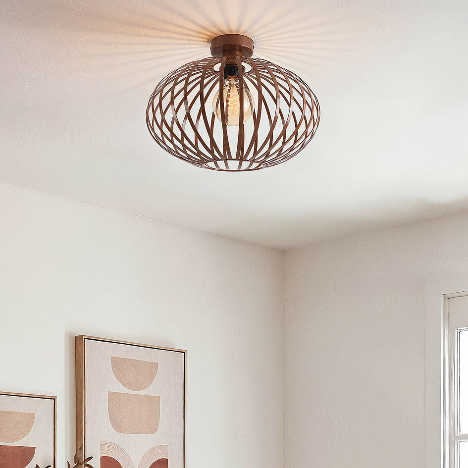 Die Deckenleuchte Grata verbindet Eleganz mit einem luftigen, zeitgemäßen Design. Der braune Metallrahmen mit offener Struktur sorgt für einen verspielten Lichteffekt und bringt Wärme und Charakter in jeden Raum. Dank der E27-Fassung (Leuchtmittel nicht im Lieferumfang enthalten) können Sie selbst das gewünschte Leuchtmittel auswählen – von warm und stimmungsvoll bis hell und modern. Grata kommt im Wohnzimmer, Flur oder Schlafzimmer wunderbar zur Geltung und verleiht Ihrem Interieur mit ihrer sanften Farbe und ihrem modernen Design einen raffinierten Akzent.