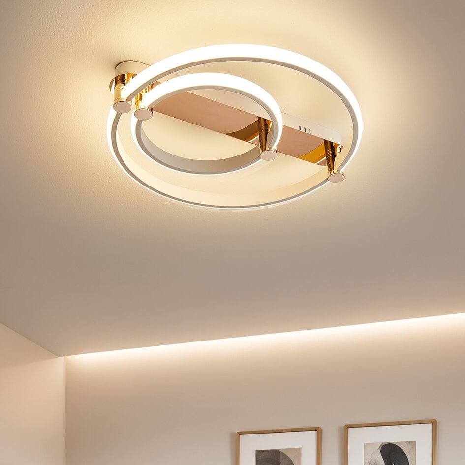 Mentha ist eine einzigartige Deckenleuchte mit zwei Ringen und unterschiedlichen Farbtemperaturen. Die zwei runden Lichtquellen erzeugen einen dreidimensionalen Lichteffekt und eignen sich hervorragend für die Beleuchtung über einem Tisch oder Arbeitsplatz. Die Kombination der weißen Farbe mit der goldenen Halterung verleiht der Mentha ein luxuriöses Aussehen. Die verschiedenen Farbtemperaturen können mit der mitgelieferten Fernbedienung gesteuert werden. So können Sie zwischen 3000K (warmweiß), 4000K (neutralweiß) oder 6000K (hellweiß) wählen. Sie können die Deckenleuchte auch dimmen und so Ihre eigene Atmosphäre schaffen.