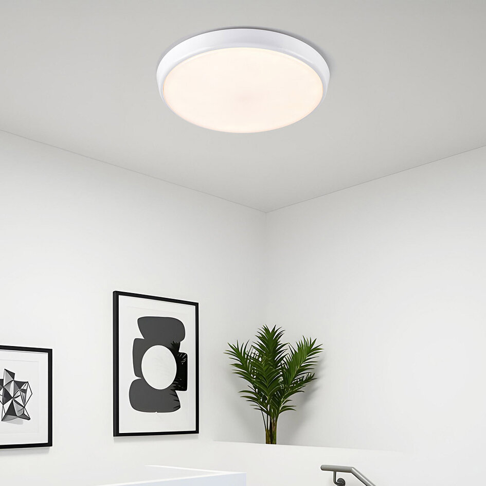 Das moderne Design dieser großen, weißen Deckenleuchte passt in fast jeden Raum. Ausgestattet mit einem robusten weißen Polycarbonatschirm ist diese Lampe ideal für den Einsatz in Hallen und Fluren innerhalb eines Gebäudes. Mit einer Lichtstärke von 15, 20 oder 25 Watt bietet die Leuchte eine ausreichende Beleuchtung für größere Räume. Um einen langen Flur oder einen großen Raum hell zu beleuchten, können Sie mehrere Deckenleuchten in einer Reihe anbringen. Die Deckenleuchte hat einen Durchmesser von 35,2 cm und eine Höhe von 4,65 cm.