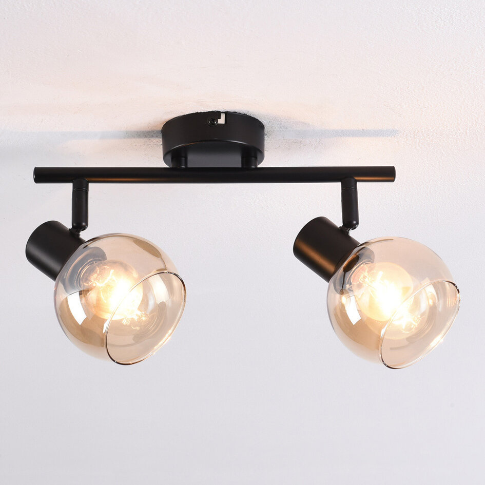 Der Deckenstrahler Phiene hat eine Breite von 30 cm, eine Höhe von 17,5 cm und die Glasschirme messen Ø11 x 7 cm. Die Deckenplatte hat eine Größe von Ø9 x 2,5 cm. Der Sockel dieser Deckenleuchte besteht aus schwarzem Metall mit milchig weißen oder amber Glasschirmen. Die Strahler sind beide drehbar.