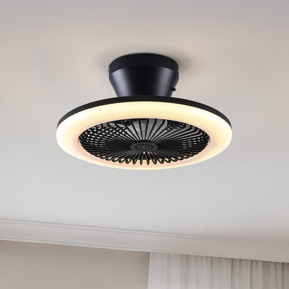 Der Deckenventilator Gale hat einen Durchmesser von 28 Zentimetern und ist 15 cm hoch. Dank der Schutzart IP20 ist der Ventilator nur für den Gebrauch in Innenräumen und in trockenen Umgebungen geeignet. Die eingebaute Lampe verfügt über dimmbare 12-W-LEDs und einen CCT-Steuermodus. Der CCT-Steuermodus (Correlated Colour Temperature control mode) ist eine Funktion von Smart Lighting oder LED-Lampen, mit der Sie die Farbtemperatur des Lichts einstellen können. Mit diesem Modus können Sie zwischen warmweißem Licht (3000K) und hellem, kühlem weißen Licht (6500K) wechseln, je nach gewünschter Stimmung oder Anwendung.