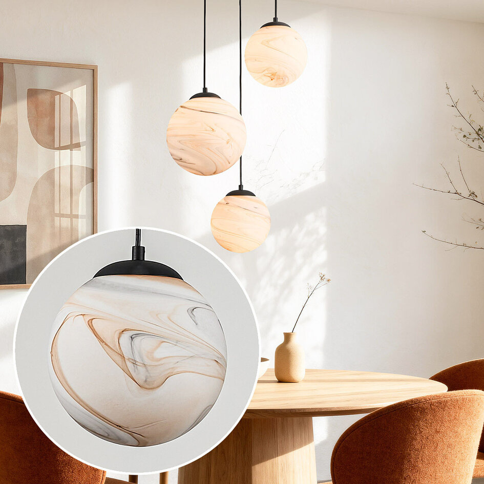 Marbelle ist eine elegante Hängelampe mit drei Glaskugeln in Marmoroptik in verschiedenen Größen. Die Kombination aus einer runden schwarzen Deckenplatte und den Kugeln in natürlicher Marmoroptik sorgt für ein luxuriöses und stimmungsvolles Ambiente. Die Glaskugeln (2× Ø20 cm und 1× Ø25 cm) hängen verspielt untereinander, wodurch diese Leuchte als Blickfang in einem Flur, in einer Ecke des Wohnzimmers oder über einem Beistelltisch fungiert.