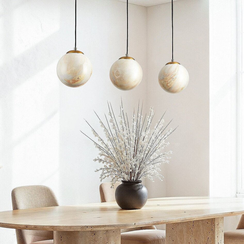 Die Hängelampe Tessra bringt Wärme, Luxus und einen sanften, modernen Look in Ihr Zuhause. Die drei runden Glaskugeln sind in einem dezenten Marmor-Look gehalten, wodurch die Lampe einen eleganten und zeitlosen Eindruck vermittelt. Die längliche Deckenplatte in Messinggold bildet einen schönen Kontrast zu den Lampenschirmen im Marmor-Look und macht die Lampe für verschiedene Einrichtungsstile geeignet – von modern und Hotel-Chic bis hin zu Japandi und zeitgenössisch. Dank der drei E27-Fassungen (max. 40 W, Leuchtmittel nicht im Lieferumfang enthalten) können Sie die Lichtstimmung selbst bestimmen, von warm und gemütlich bis hell und funktional.