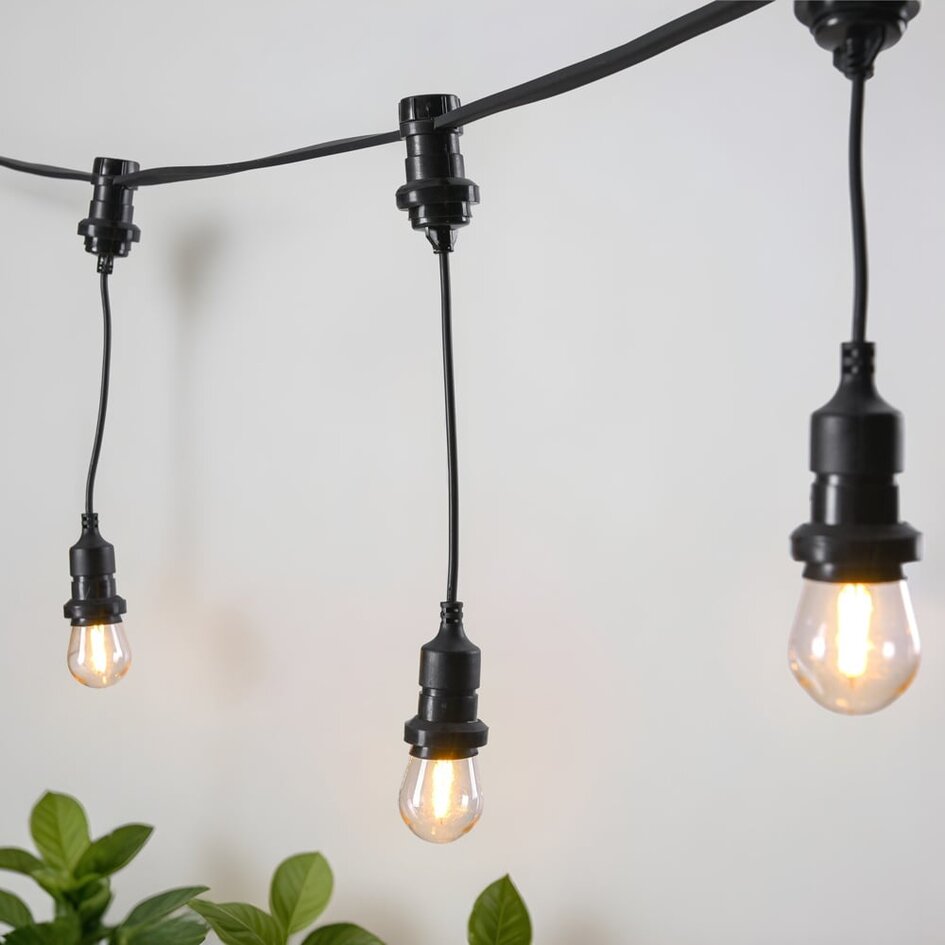 Mit einer hängenden E27-Fassung können Sie einen schwebenden Lichteffekt nach Ihrem Geschmack erzeugen. Sind Sie mit Ihrer aktuellen Illu-Lichterkette nicht zufrieden und fehlen Ihnen hängende Fassungen für einen spielerischen Effekt? Dann ist diese hängende Fassung perfekt, um Ihre Illu-Lichterkette mit E27-Fassungen genau so zu gestalten, wie Sie es möchten. Sie können die hängenden Fassungen einfach in eine vorhandene E27-Fassung einschrauben. Dann schrauben Sie ein warmweißes E27-Leuchtmittel oder farbige E27-Glühbirnen (nicht im Lieferumfang enthalten) in die hängende Fassung. Auf diese Weise können Sie mit verschiedenen Längen den Beleuchtungsplan variieren und eine einzigartige Atmosphäre schaffen.