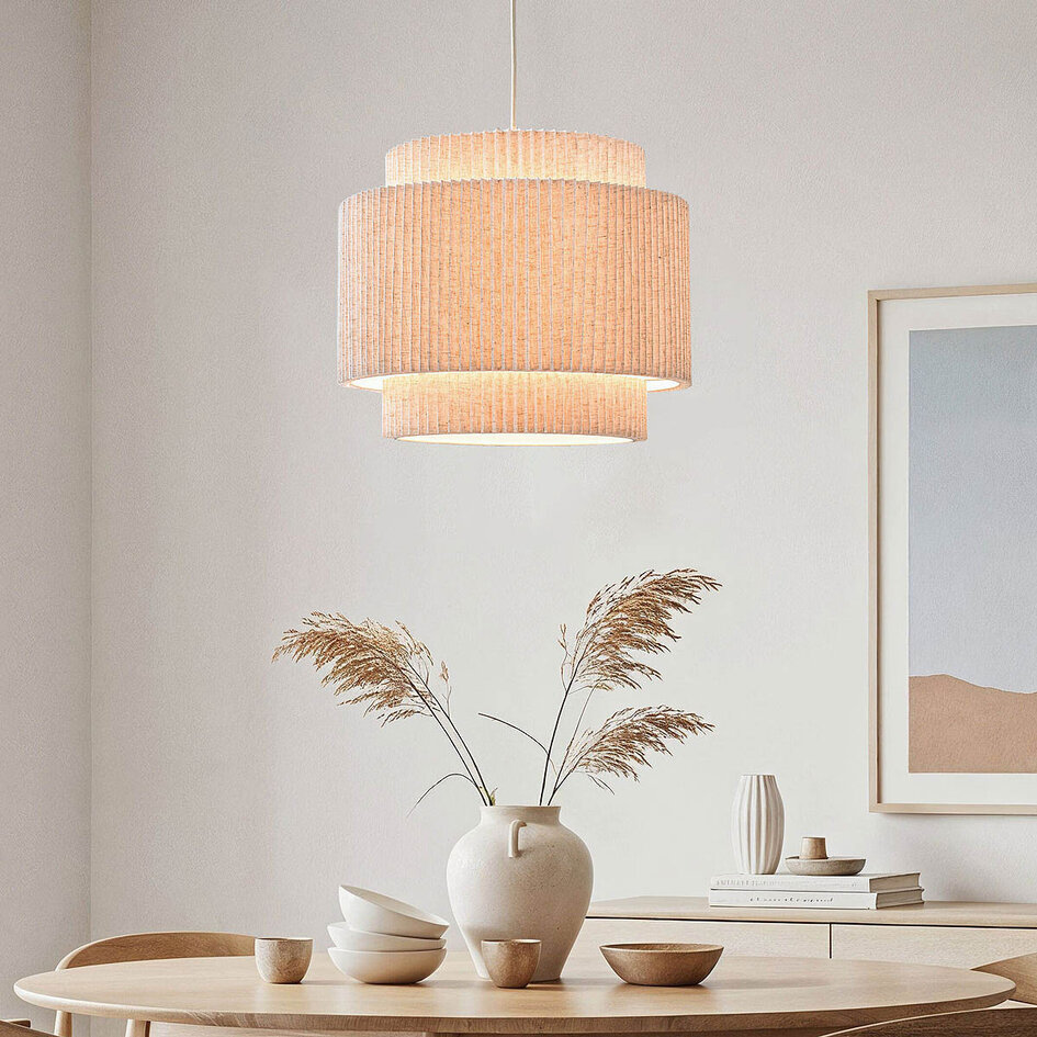 Schaffen Sie mit der Pendelleuchte Tressa eine warme und stilvolle Atmosphäre in Ihrem Zuhause. Diese elegante Leuchte mit dreilagigem, geripptem Stoffschirm in Beigetönen verleiht jedem Interieur einen Hauch von Ruhe und Eleganz. Die Kombination aus Textilien, abgerundeten Formen und warmen Farbtönen macht diese Leuchte perfekt für japanische oder Boho-Einrichtungen.
