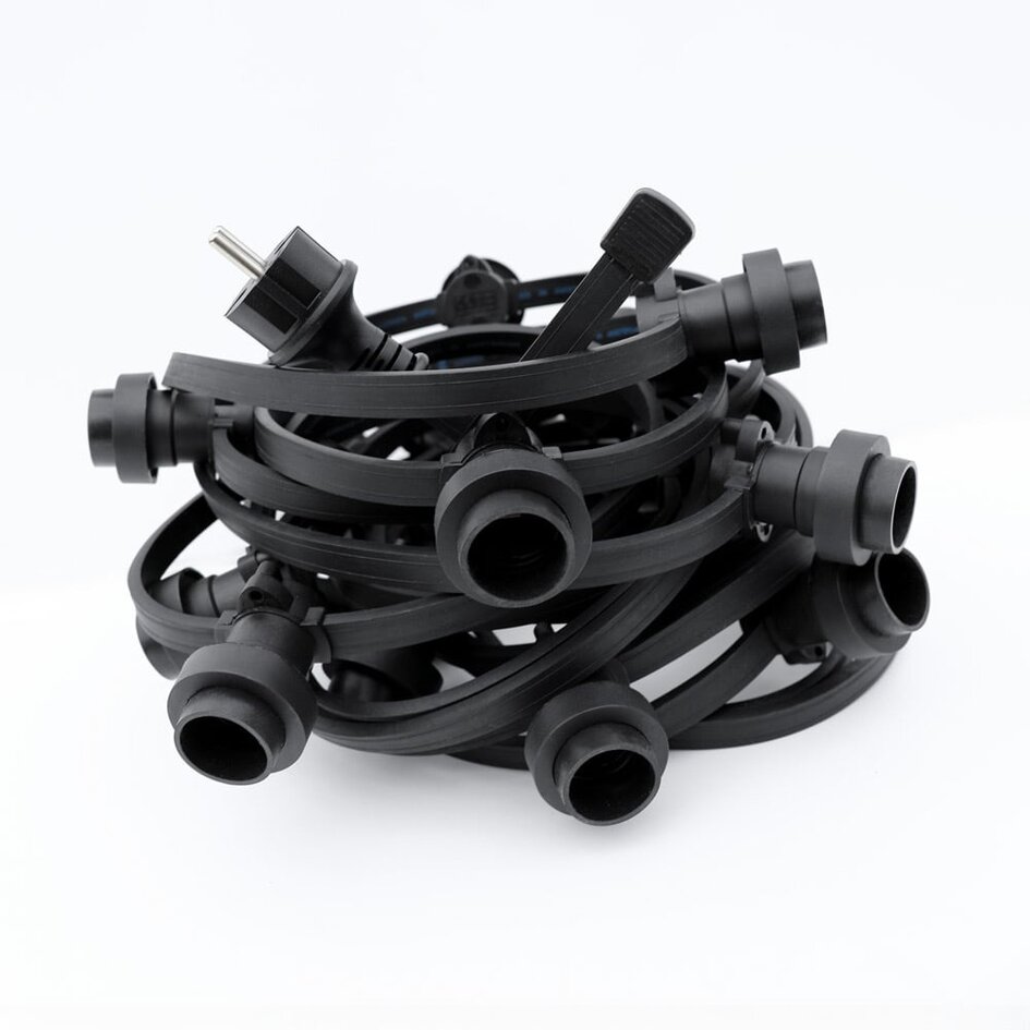 Diese 35 Meter Illu Lichterkette ist ideal, um Ihrem Garten, Ihrer Party oder Ihrem Restaurant eine gewisse Atmosphäre zu verleihen. Das Schöne an unseren Illu Lichterketten ist, dass sich das Produkt im Laufe der Zeit kaum verändert hat. Unsere robusten Illu Lichterketten sind aus hochwertigem Gummi gefertigt und enthalten einen Kupferkern in den Maßen 2 x 1,5 mm². Die Illu Lichterketten sind für den Gebrauch in Außenbereichen geeignet. Unsere Illu Lichterketten sind Plug-and-Play-Lösungen, d. h. die E27 Fassungen, der Konturenstecker, die Dichtringe und die Endkappe sind vormontiert. Nach Erhalt dieser Illu Lichterkette müssen die Glühbirnen nur noch in die E27 Fassungen geschraubt werden.