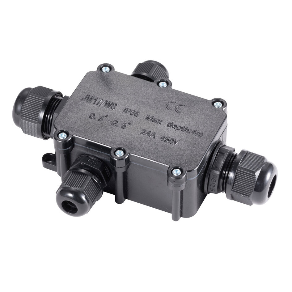Dieser wasserdichte Verbinder ist ideal für den Anschluss mehrerer Kabel Ihrer Gartenbeleuchtung zur gleichen Zeit. Mit diesem Verbinder können Sie vier Kabel miteinander verbinden. Der Verbinder ist aus Kunststoff gefertigt. Die maximale Anschlussspannung dieses Verbinders beträgt 450V(AC)24A. Die Abzweigdose hat eine Länge von 9,6 Zentimetern, eine Breite von 6,5 Zentimetern und eine Höhe von 3,5 Zentimetern. Sie bietet Platz für zwei PG11-Kabel und zwei PG13.5-Kabel.