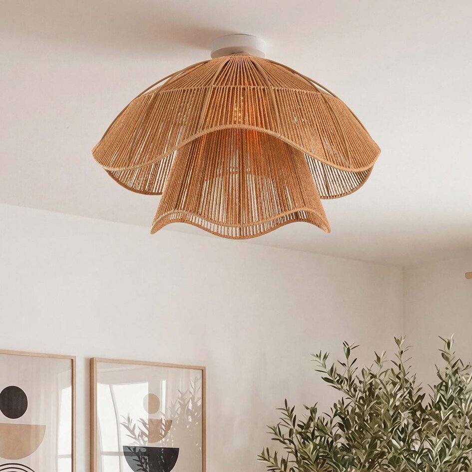 Die Deckenleuchte Eira bringt eine luftige, natürliche Atmosphäre in Ihr Zuhause. Der mehrschichtige Schirm wurde sorgfältig aus feinem Papiergarn gefertigt, was für ein verspieltes Linienspiel und eine weiche, organische Silhouette sorgt. Die warme, natürliche Farbe und die wellenförmige Form passen mühelos zu Japandi-, Boho- und modernen Interieurs.