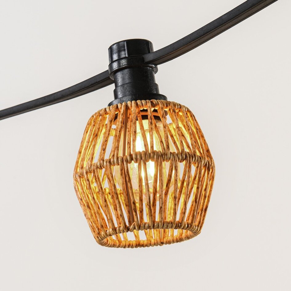 Verleihen Sie Ihrer Lichterkette mit diesen verspielten Lampenschirmen in gelbbrauner, melierter Rattanoptik einen warmen und natürlichen Look. Das leichte Kunststoffmaterial ist robust und wetterfest, sodass die Schirme sowohl für den Innen- als auch für den Außenbereich geeignet sind. Verwandeln Sie Ihren Garten, Ihre Terrasse oder Ihren Balkon in einen charmanten Ort für lange Sommerabende oder gemütliche Partys. Kombinieren Sie die Schirme mit anderen Farben für einen verspielten Effekt oder entscheiden Sie sich für einen harmonischen und beruhigenden Look mit einer einzigen Farbe. Dank ihrer kompakten Größe (Ø 9,5 x 8,6 cm) lassen sich die Schirme einfach anbringen und schaffen im Handumdrehen eine stilvolle und gemütliche Atmosphäre.