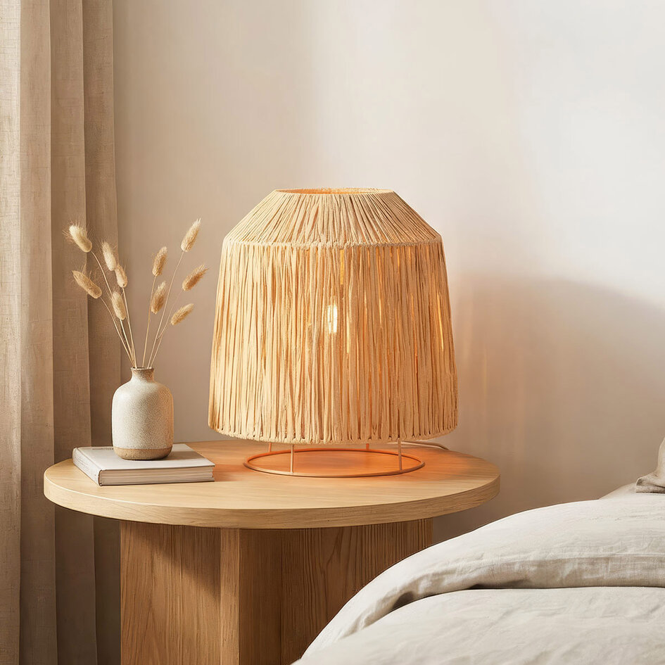 Die Tischlampe Aruna bringt mit ihrem Lampenschirm aus fein gewebtem Raffiabast eine sanfte, natürliche Atmosphäre in Ihr Zuhause. Die verspielte Struktur filtert das Licht auf warme Weise und sorgt für ein ruhiges Schattenspiel im Raum. Dank ihrer kompakten Größe eignet sich Aruna für einen Beistelltisch, eine Kommode oder einen Nachttisch, wo sie sofort Atmosphäre in natürliche, Boho- und Japandi-Interieurs bringt. Die Lampe ist mit einer E27-Fassung ausgestattet (Leuchtmittel nicht im Lieferumfang enthalten), sodass Sie die Lichtfarbe und -intensität selbst bestimmen können.